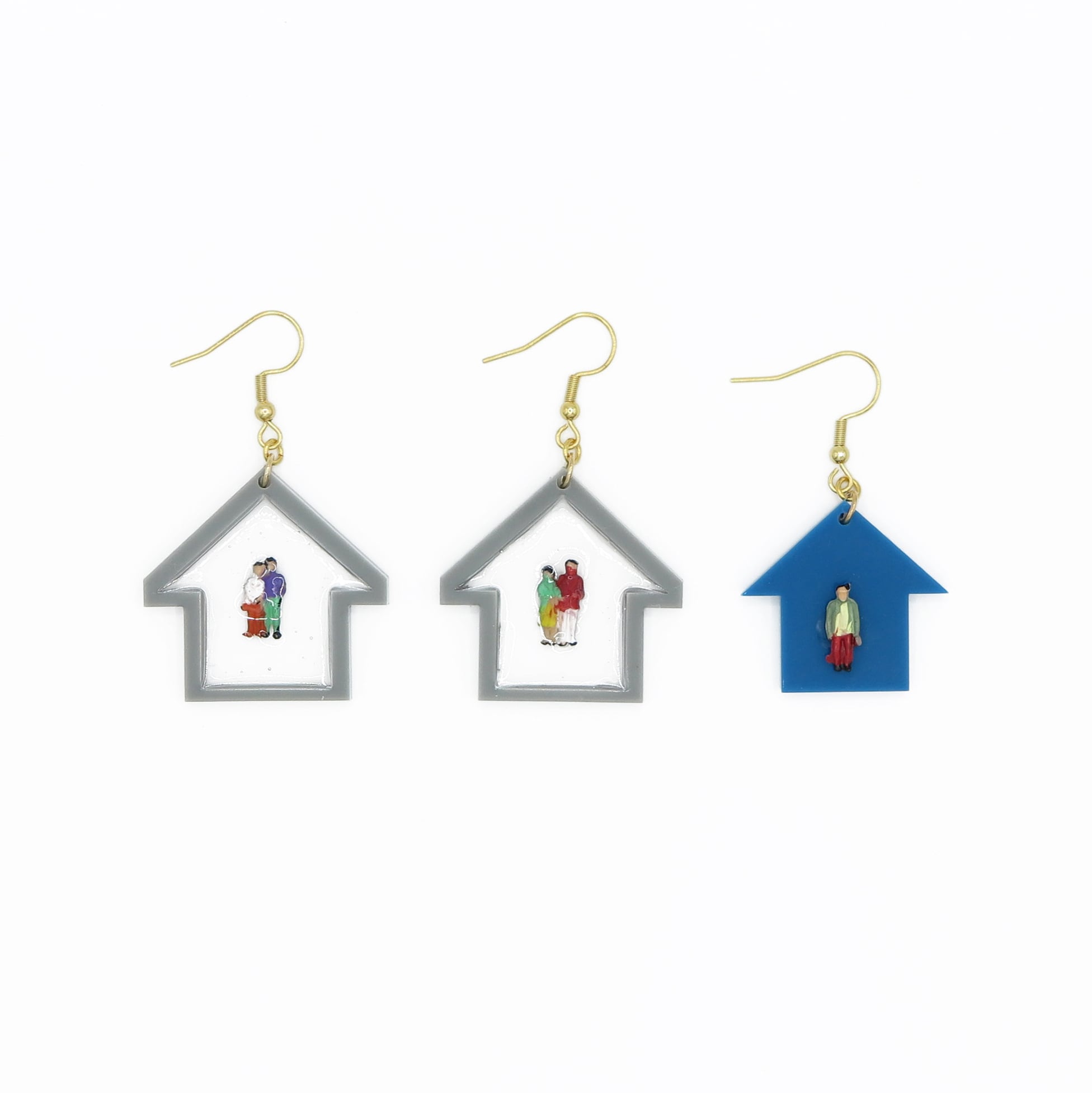 一軒家で暮らす人々をイメージした、現代の民族アクセサリー。家のフレームの中に、透明なレジンで小さな人形を固めています。付けてみると人形が浮いているように見えてかわいい。ピアス1セットにつき、ミニお家ピアスがおまけで1つ付いてきます。組み合わせを変えて付けてみても。